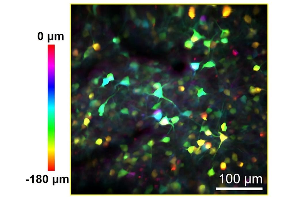 Integrated electrical tunable lens enables rapid z‑sectioning, capturing activity across multiple cortical layers in 3D.